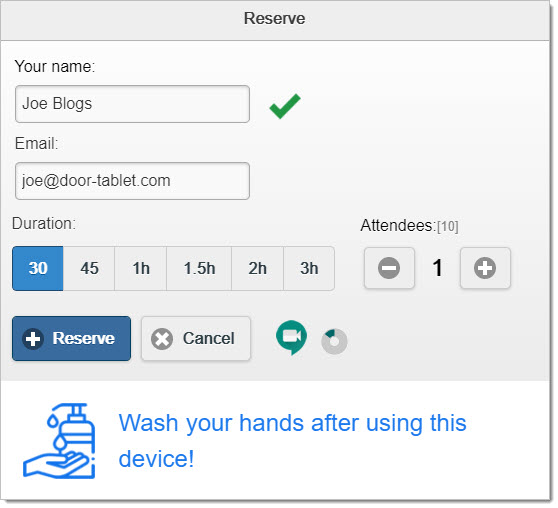 When you create a reservation in Door Tablet, an on-line Meet meeting will always be created, and the Meet icon will show to indicate that the function is enabled. If you provide your email address Door Tablet will email you both your Check-in code, and the joining link, so that you may forward these details to other participants who are not present.